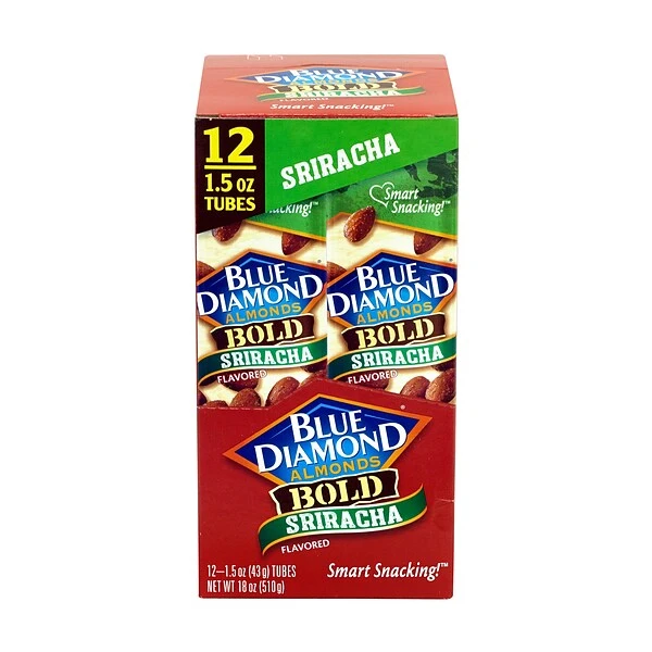 - A 12 count box of Blue Diamond Almonds with a bold Sriracha flavor