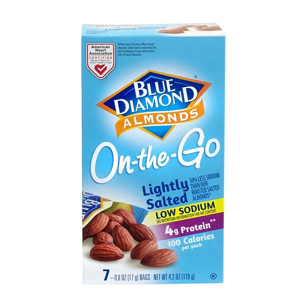 - A 42-Pack box of Blue Diamond Nuts low sodium and lightly salted Almonds in easy to go pouches