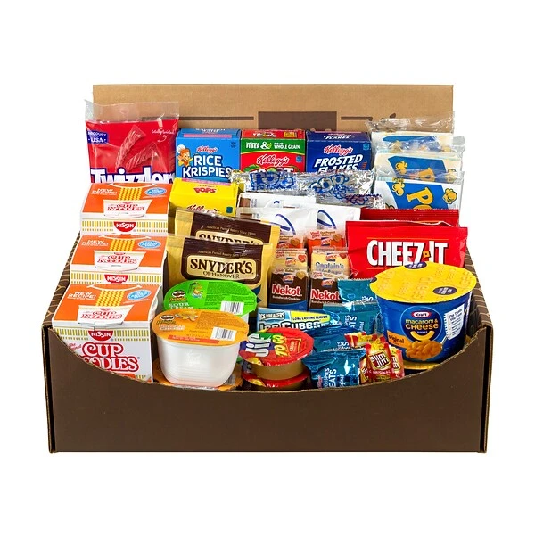 - Each box contains: three Maruchan Chicken Flavored Instant Lunch, two Kraft Mac & Cheese Easy Mac Cups, five Kellogg’s Cereal Assortment, four Jif, four Orville Redenbacher’s Movie Theater Butter Classic Bag, five Rice Krispies Treats, six Slim Jim Original, six Lance Cookie & Cracker Variety, three Sunshine Cheez, four Pringles Variety Pack, three Carnation Breakfast Essentials, three Snyder’s Mini Pretzels 100 Calorie Bag, four PopTarts Strawberry & Brown Sugar Cinnamon Variety, and more