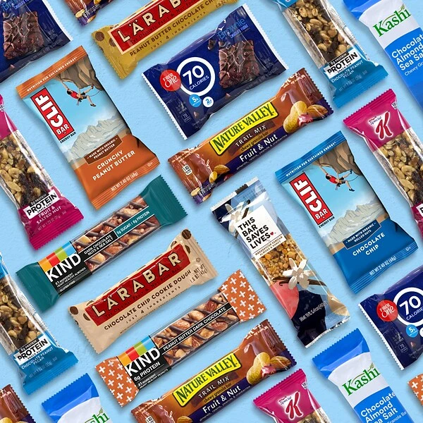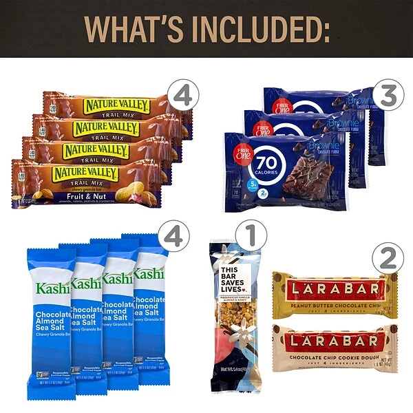 - Each box contains: Kind Bars Dark Chocolate Cinnamon Pecan, four Kashi Chocolate Almond & Sea Salt, two Brookside Dark Chocolate Fruit & Nut Bars, two Cliff Bar Variety, two Larabar Cashew Cookie, Apple Pie, & Peanut Butter Cookie Variety, five Nutri Grain Fruit & Nut Granola Bars Variety Pack Cherry Almond & Blueberry Almond, four Nature Valley Fruit & Nut Trail Mix Chewy Granola Bars, three Fiber One Chewy Bars Oats and Chocolate