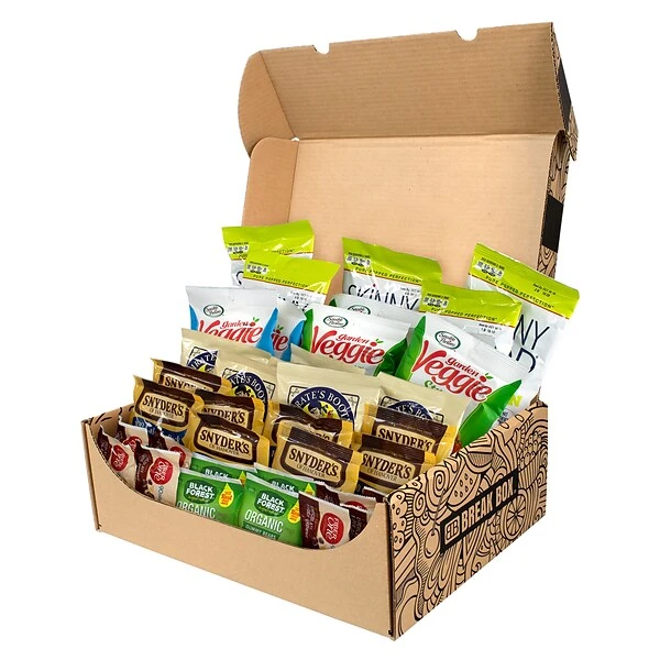 Stock a delicious snack assortment in the break room or in guest accommodations with this variety box, which has an assortment of crunchy, salty, and chocolatey snacks to avoid a sugar overload. This Snack Box Pros variety box includes a tasty array of Stonyfield fruit snacks, Snyder’s pretzels, Pirate’s Booty, Skinny Pop, Veggie Straws, and Fiber One brownies for everyday eating.