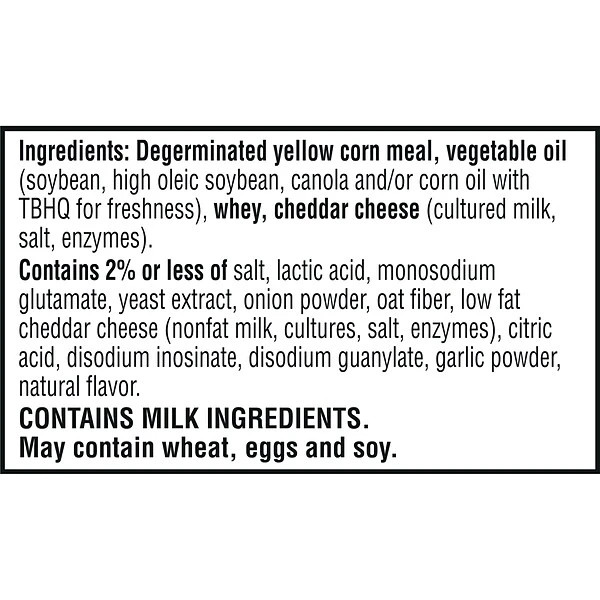 - Ingredients: enriched flour, vegetable oil (soybean and palm oil with TBHQ for freshness), white cheddar cheese (milk, cheese cultures, salt, enzymes), contains 2% or less of salt, whey, cheddar cheese (milk, cheese cultures, salt, enzymes), monosodium glutamate, whey protein concentrate, butter, baking soda, yeast, natural and artificial flavor, lactic acid, calcium lactate, disodium phosphate, citric acid, turmeric extract color, annatto extract color, soy lecithin