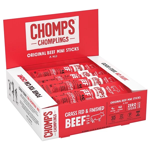 Original Beef Chomplings are mini beef jerky sticks made from 100% grass-fed & finished beef that’s free of antibiotics and hormones for a savory snack with slightly smoky and slightly spicy flavor. Chomps is the first, shelf-stable meat snack brand to be Non-GMO.