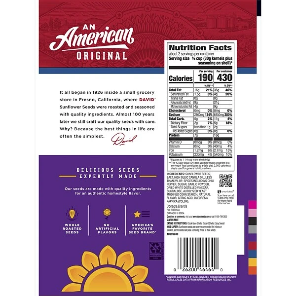 The roasted and salted sunflower seeds in this David Jumbo Seeds Sweet and Spicy, 5.25 oz, 12 Count are still the same flavor and quality of the David seeds you’ve been enjoying for years. Quality seeds, roasted and seasoned to perfection! This 12 pouch case is bursting with salted sunflower seeds in 5.25 ounce reasealable bags. Great for snacking on in the office or sharing with coworkers, these David Sunflower Seeds are grown for greatness. David Jumbo Seeds Sweet and Spicy, 5.25 oz, 12 Count let you bring the classic ballpark seed taste and bring them wherever you want a crunchy, sweet and spicy treat!