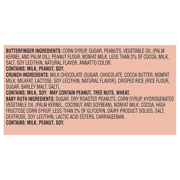 - Assortment of tastes: Discover great tastes like peanut-buttery Butterfinger—the milk chocolate and crisped rice of CRUNCH—the rich caramel, crispy rice and chocolate of 100 Grand—and the peanuts, milk chocolate, caramel and nougat of Baby Ruth