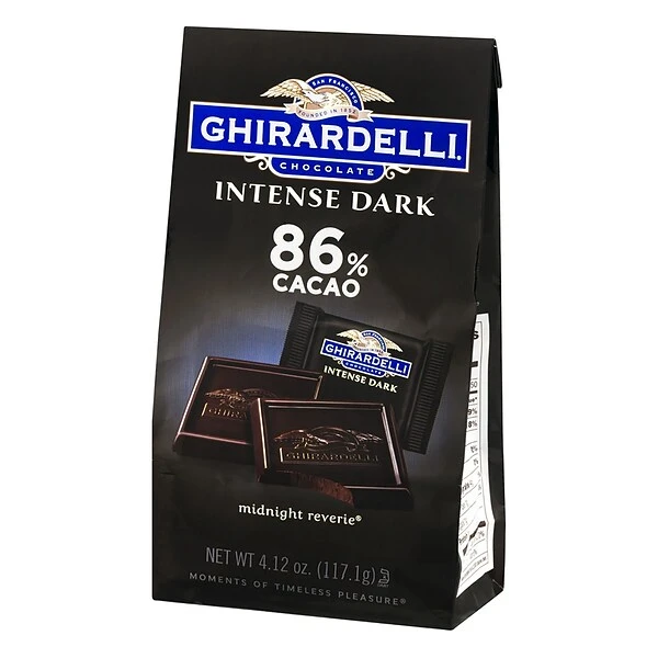 - Three 4.12 oz. packs of Ghirardelli Intense Dark Midnight Reverie 86% Cacao Singles Bag