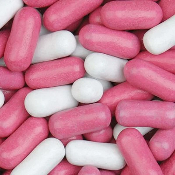 - Black licorice candy in a colorful mix of pink and white