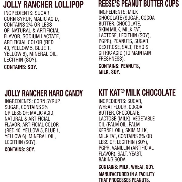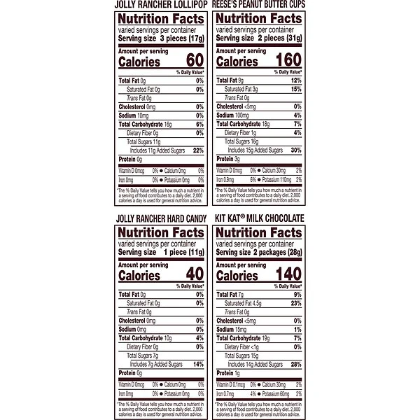 - Includes REESE’S milk chocolate peanut butter cups, KIT KAT® milk chocolate wafer candy bars and JOLLY RANCHER fruit-flavored lollipops and hard candy