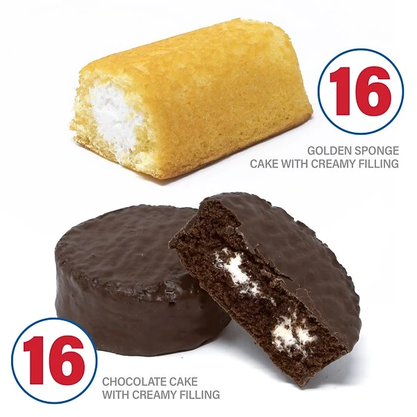 A 32 count box of Hostess Twinkies and Ding Dongs. With 16 golden sponge cakes with cream filling and 16 chocolate cakes with cream filling and hard chocolate exteriors per box. These Hostess classics are the perfect after school snack or treat to surprise your kids with in their lunch boxes. Keep these stocked in the pantry or office breakroom to keep the entire family and office happy. Tasty mini cakes without the hassle of baking, just unwrap and enjoy!