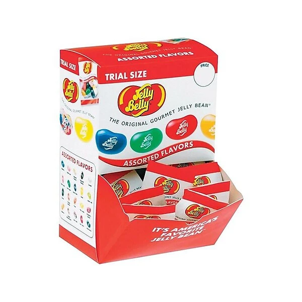 Savor 20 assorted flavors of Jelly Belly gourmet jelly beans. Each box contains 80 individually wrapped pouches of jelly beans in convenient trial-size units, and the recipe is kosher, fat-free, gluten-free, and peanut-free. Suitable for vegetarian and vegan diets, these sweet treats contain no dairy, eggs, or gelatin. These Jelly Belly assorted gourmet jelly beans are a versatile snack with a range of fun flavors.