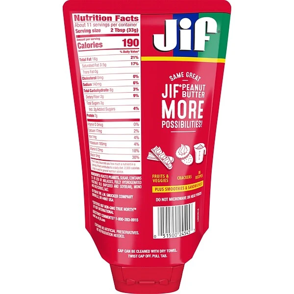 The same delicious Jif peanut butter you love, now available in an easy-to-squeeze pouch. Jif squeeze creamy peanut butter has a smooth, creamy texture right out of the pouch. One bite of Jif squeeze creamy peanut butter, and you’ll be reminded of your very best childhood memories. Make sandwiches and smoothies to fuel a long afternoon of school and practice, bake delicious cookies while making memories with the family, and of course, take with you for on-the-go snacks wherever and whenever the craving strikes. It’s so easy to use, even kids can serve themselves. With a convenient and portable 13 oz. peanut butter pouch, you’ll always have this classic peanut butter treat on hand.
