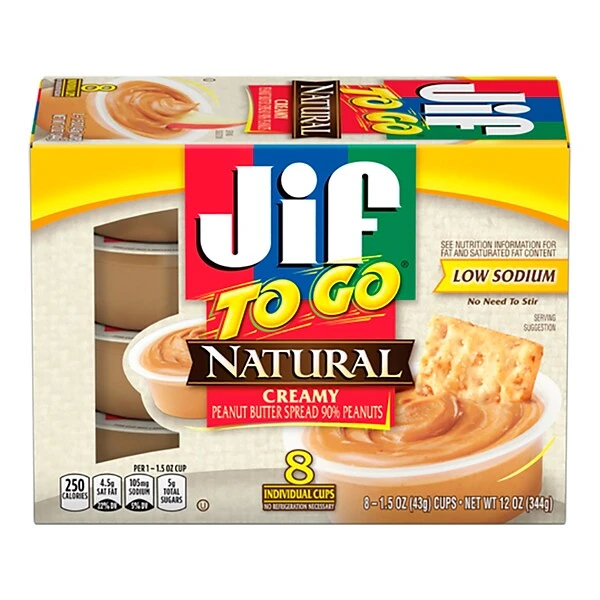 Round, plastic portion-control cups make peanut butter convenient anywhere: from tabletop caddies and buffets to grab-and-go snacks and more. The delicious taste of Jif To Go Natural peanut butter spread in a convenient, right-sized cup. Perfect for dipping your favorite snacks.