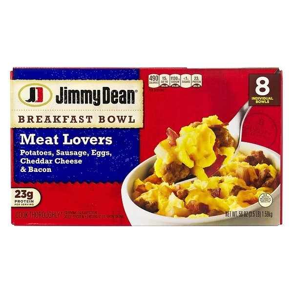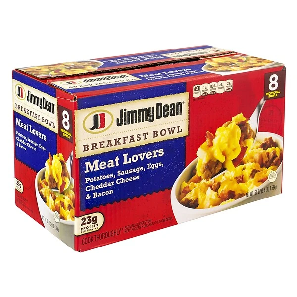 - An 8 count box of Jimmy Dean Meat Lovers Breakfast Bowls