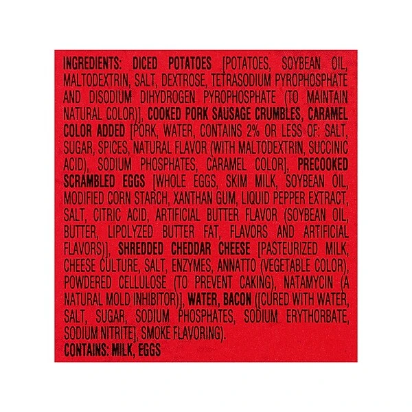 - Eggs, Potatoes, Sausage, Cheddar Cheese, and Bacon
