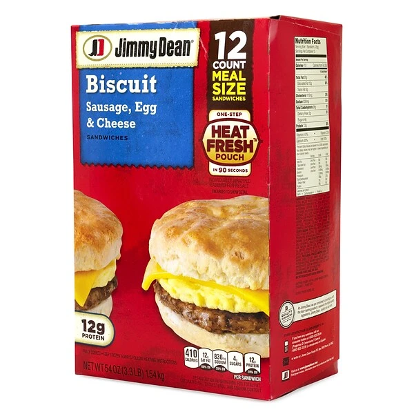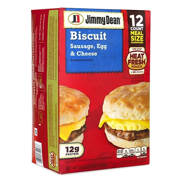 - A 12 pack box of Jimmy Dean Sausage, Egg, and Cheese Biscuit Sandwiches