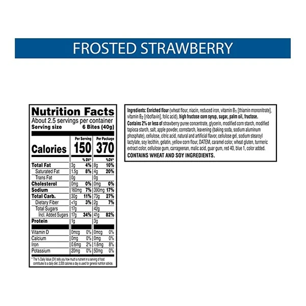 - Ingredients: enriched flour (wheat flour, niacin, reduced iron, vitamin B1, vitamin B2, folic acid), corn syrup, sugar, palm oil, fructose, strawberry puree concentrate, glycerin, modified corn starch, modified tapioca starch, salt, apple powder, cornstarch, leavening, cellulose, citric acid, natural and artificial flavor, cellulose gel, sodium stearoyl lactylate, soy lecithin, gelatin, yellow corn flour, DATEM, caramel color, gluten, turmeric extract, cellulose gum, carrageenan, malic acid