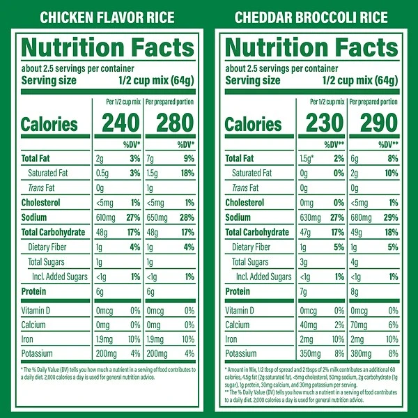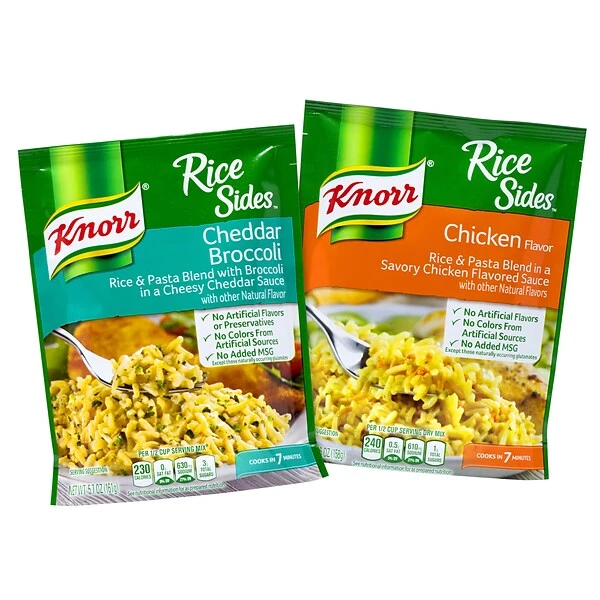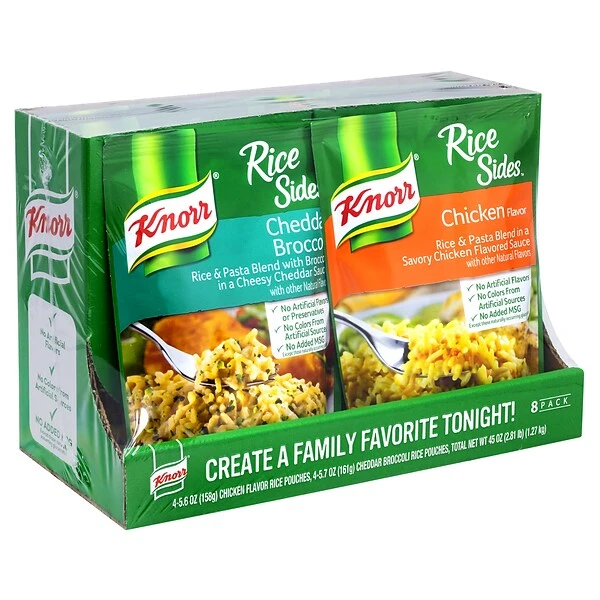 - Includes four Knorr Cheddar Broccoli Rice Sides, and 4 Knorr Chicken Rice Sides, 5.6 oz. each