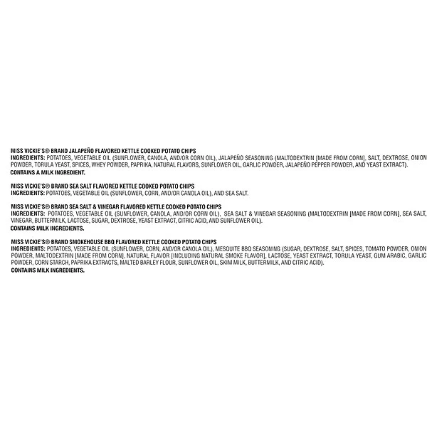 Looking for a crisp, delicious snack in excitingly different flavors? Miss Vickie’s Kettle Cooked Mix, 30 Count has everything you’re looking for. With 12 Jalapeno, 6 Sea Salt and Vinegar, 6 Smokehouse BBQ, 6 Original Recipe, this 30 count box will last a long time. Perfect for the employee breakroom, or for storing at home and bringing some with lunch for the day. Miss Vickie’s Kettle Cooked Mix, 30 Count is a great change of pace from regular chips!