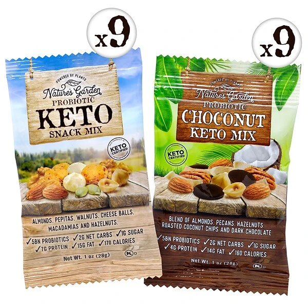 An 18 count pack of Nature’s Garden Probiotic Variety Snack Packs with 9 – 1oz indiviudal servings of Probiotic Keto Snack Mixes and 9 Choconut Keto Mixes. Both mixes are high in fat and protein but low in carbs making them a great Keto certified snack. Whether you prefer salty and cheesy or coconut and chocolate this snack pack variety has it all!