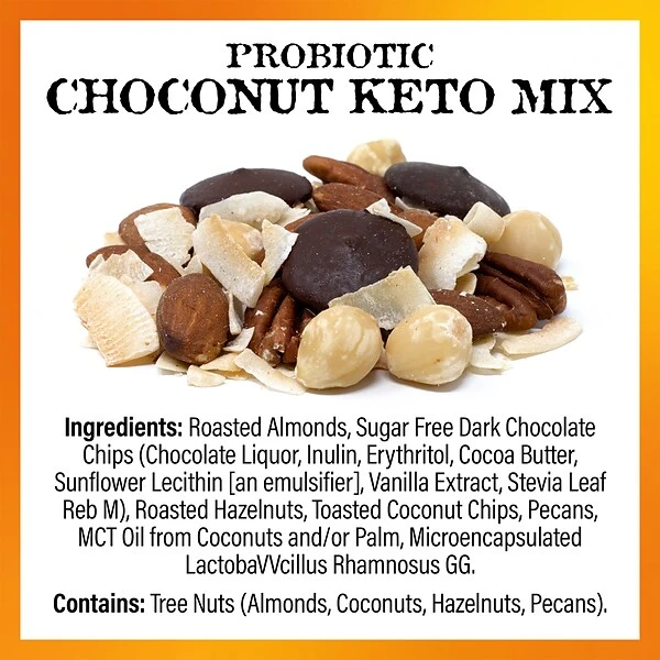 - Choconut Keto Mix includes almonds, pecans, hazelnuts, roasted coconut chips and dark chocolate with 14 grams of fat and only 2 net carbs