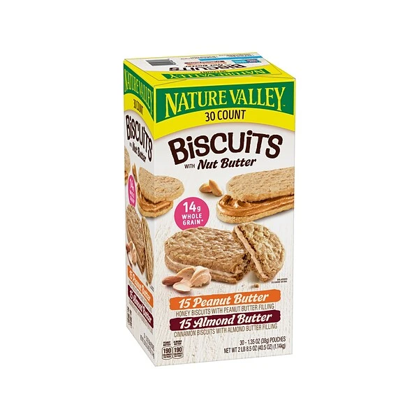 - Pack contains 15 honey biscuits with peanut butter filling and 15 cinnamon biscuits with almond butter filling