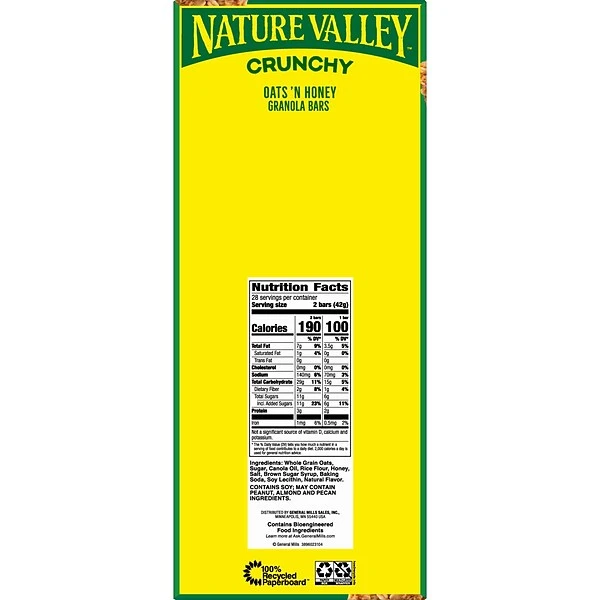 Keep your pantry or break room stocked with quick and easy snacks with this box of granola bars. Made of all-natural ingredients, these bars are a great option for before or after games, meetings, practices, and more. These Nature Valley oats-and-honey granola bars are sold in a box of 28 for convenient bulk purchasing.