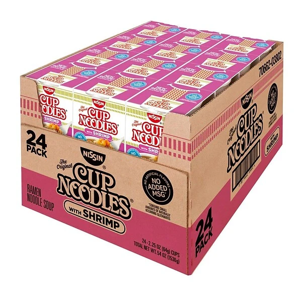 - A 24 count pack of Nissin Cup Noodles Soup with Shrimp