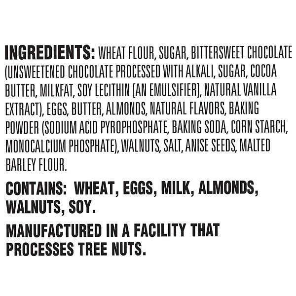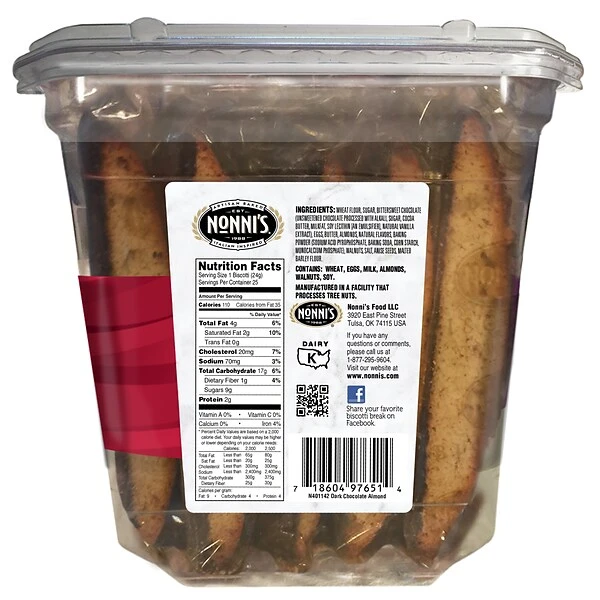 Made with wheat flour, butter, real chocolate and California almonds!Dark Chocolate almond made with 55% cacao 110 calories per biscottiIndividually wrapped for grab and go!Kosher