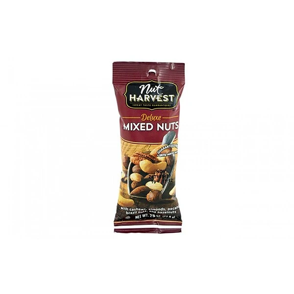 Grab a pouch of Nut Harvest Deluxe Mixed Nuts , 2.75 oz., 8 Pack and crunch your way through a hearty and crunchy mixture. Packed with Cashews, Almonds, Pecans, Brazil Nuts and Hazelnuts, this Nut Harvest Mix is a great source of healthy, nutritious snacks. Nut Harvest Deluxe Mixed Nuts , 2.75 oz., 8 Pack is great for packing in with your lunch at the office, grabbing on-the-go, or eating in-between meetings!