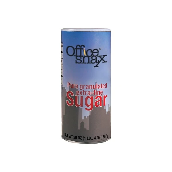 Provide sweetener for food or beverages with this extra-fine granulated cane sugar. The 20-ounce canister fits easily in a break room cabinet, and the convenient reclosable container keeps sugar pristine for multiple users. This Office Snax sugar comes in a 24-count pack.
