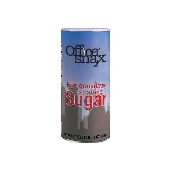 Add a touch of sweetness to coffees, teas and other drinks with these canisters of sugar. Featuring a reclosable design, these canisters prevent spills, making them a great choice for the break room, lobby or other area. These Office Snax reclosable canisters come with 20 ounces of sugar.