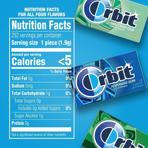 With ORBIT Sugar Free Gum, delicious variety pack of ORBIT Spearmint Chewing Gum, ORBIT Wintermint Chewing Gum, ORBIT Sweet Mint Chewing Gum, ORBIT Peppermint Chewing Gum flavors that give you a clean and fresh mouth feeling so you’re ready to seize your moment with this bulk gum assorted pack.