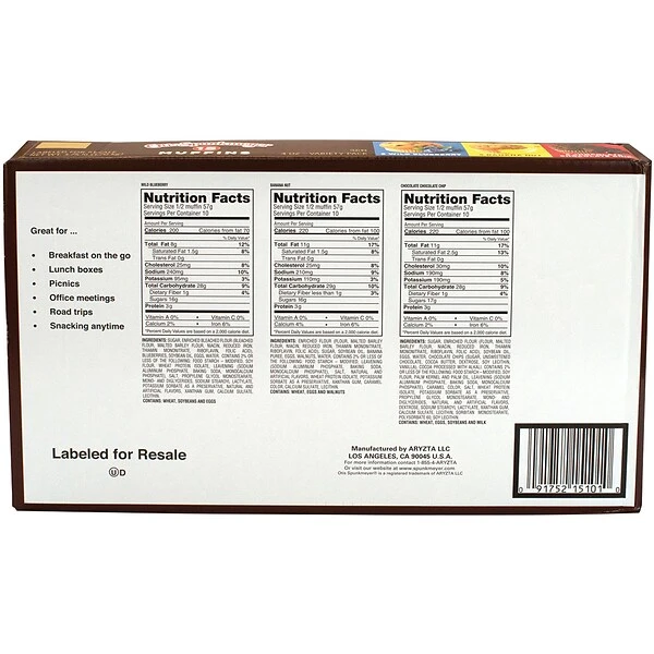 - Individually wrapped muffins in banana nut, chocolate chip, and wild blueberry