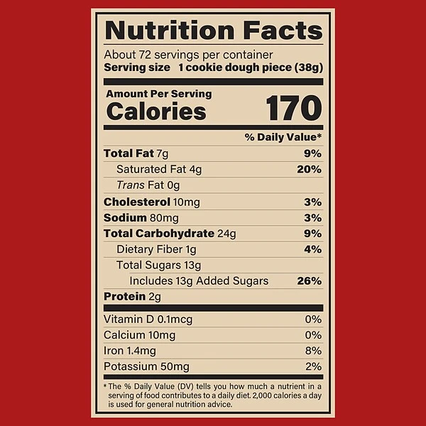 1.33 ounce cookie dough pieces with chocolate chunks throughout and no added colors. The dough pieces are flash frozen to help maintain maximum freshness and are packaged for retail sale as frozen cookie dough.