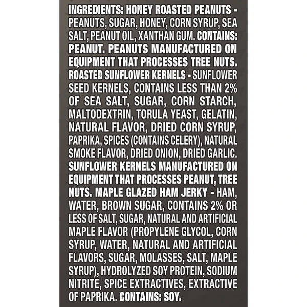 - Contains peanuts, beef jerky, sunflower kernels