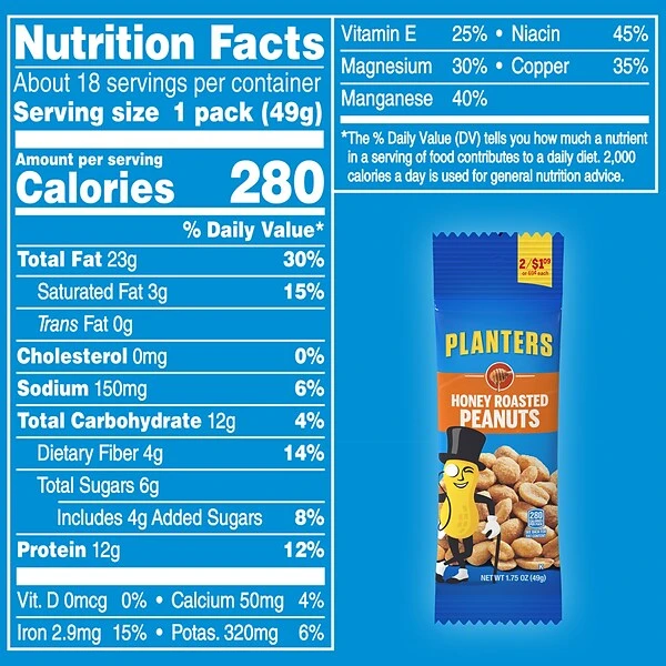 These pouches of peanuts are perfect for eating on-the-go, in between meetings, or when you’re lounging around the house! Planters Honey Roasted Peanuts, 1.75 oz, 18 Count are bursting with deliciously crunchy flavor. Each box contain eighteen 1.75 ounce pouches of Honey Roasted Peanuts. These peanuts are a great alternative to sugary or unhealthy snacks. Planters Honey Roasted Peanuts, 1.75 oz, 18 Count is a must have for the office break room, or packed in your lunch each day for a protein-packed peanut snack!
