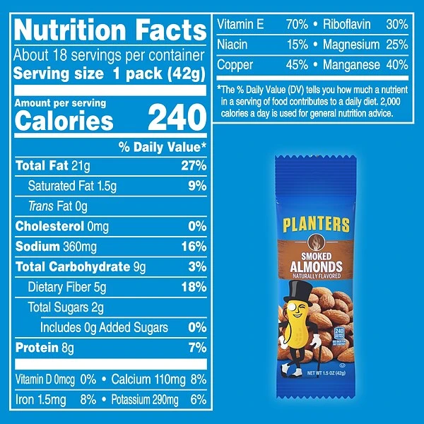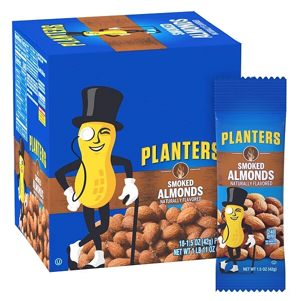 These pouches of peanuts are perfect for eating on-the-go, in between meetings, or when you’re lounging around the house! Planters Smoked Almonds, 1.5 oz, 18 Count are bursting with deliciously crunchy flavor. Each box contain eighteen 1.75 ounce pouches of Smoked Almonds. These almonds are a great alternative to sugary or unhealthy snacks. Planters Smoked Almonds, 1.5 oz, 18 Count is a must have for the office break room, or packed in your lunch each day for a protein-packed almond snack!