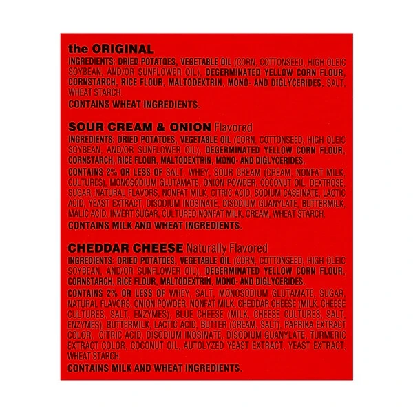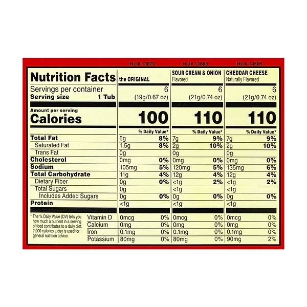 - Carton contains: 12 cheddar cheese flavored containers, 12 sour cream and onion flavored containers, and 12 containers with the original flavor (36 containers total)