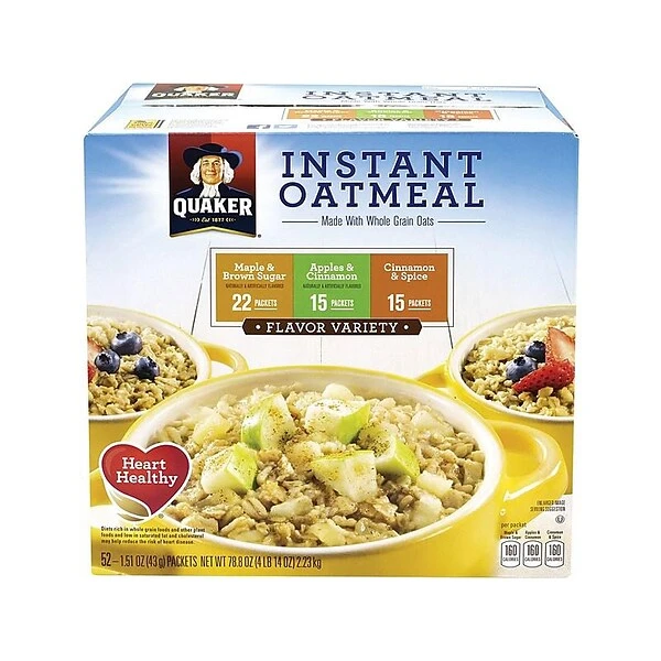 Enjoy a warm and comforting morning meal with these microwaveable oatmeal pouches. Each 52-count box offers plenty of choices, thanks to a combination of maple and brown sugar, apples and cinnamon, or cinnamon and spice oatmeal. Ideal for busy mornings, Quaker oatmeal packets are ready in just 90 seconds.