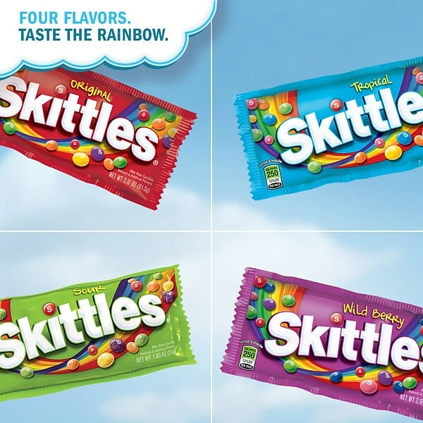 Share the rainbow when you stock up on with a bulk box of single size SKITTLES Tropical Fruity Candy. Every single size pack of SKITTLES Candy is filled with tropical fruity flavor, including banana berry, kiwi lime, mango tangelo, pineapple passionfruit, and strawberry star fruit. TASTE THE RAINBOW.