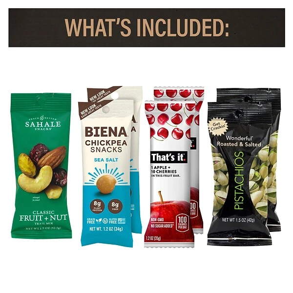 - 2 bags of HIPPEAS Organic Chickpea Puffs Sriracha Sunshine, 2 THAT’S IT Gluten Free Apple + Cherry Fruit Bars, 3 bags of Skinny Pop 100 Calorie, 2 bags of WONDERFUL Roasted & Salted Pistachios, 1 bag of SAHALE Snacks Classic Fruit & Nut Trail Mix, 3 MADEGOOD Organic Chocolate Chip Granola Bars, and 2 bags of BIENA Chickpea Sea Salt Snacks