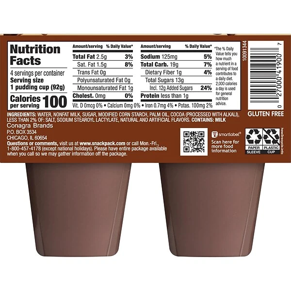 Enjoy a creamy, delicious treat any time of day with Snack Pack Chocolate Pudding Cups. This chocolate pudding dessert is the original treat that no one can resist. Gluten-free and Kosher, Chocolate Snack Pack Pudding Cups are made with real milk and no high-fructose corn syrup. While perfect for your child’s lunch box, these tasty pudding cups make a great treat for Mom and Dad, too. Snack Pack Chocolate Pudding Cups have 100 calories with no preservatives and zero grams trans-fat per 3.25 oz serving. Contains 12 packs of 4 pudding cups, 48 total.