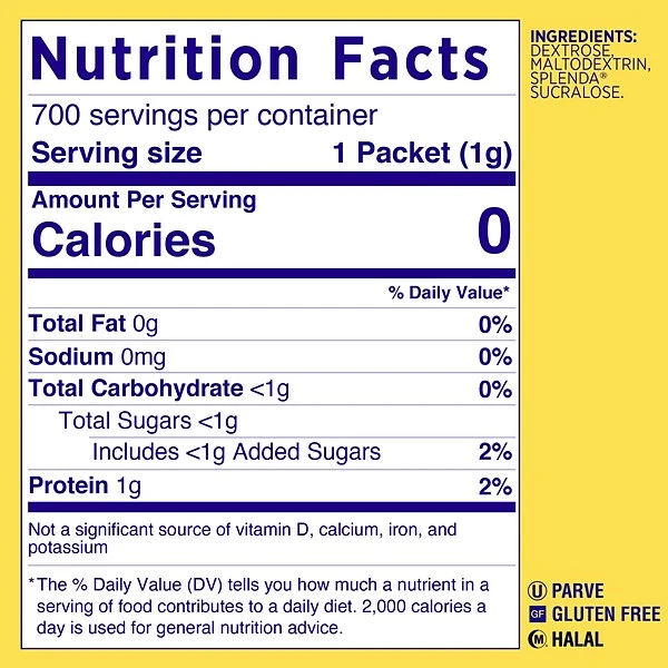 - Ingredients: dextrose, maltodextrin, and sucralose