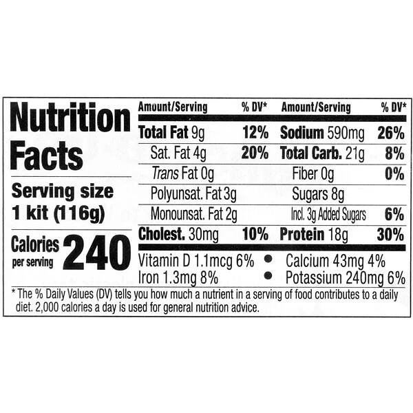 - 240 calories per kit for a low calorie, high protein snack or meal