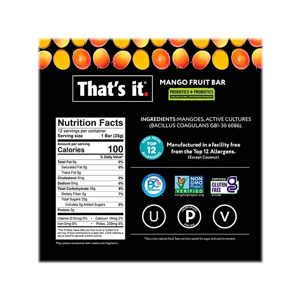 - Mango probiotic fruit bar is a groundbreaking snack that contains only mango and probiotics