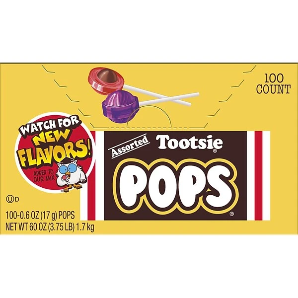 Introduce a delicious treat to your workplace by offering these candy-filled lollipops. This 100-count box contains an assortment of classic flavors and is ideal for any office or business with frequent customers. At only 60 calories per pop, these candy-coated sweets with a chewy center are a timeless favorite among people of all ages. Keep these Tootsie Pops on the reception counter for customers and clients to treat themselves.