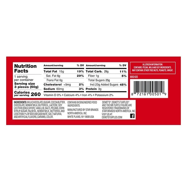 Demet’s® Turtles® Chocolate covered pecans in caramel flavor are very delicious to taste. Chocolate covered pecans are stuffed in a 1.76 oz pack and are ideal for fun parties, sold as 24 packs per box.