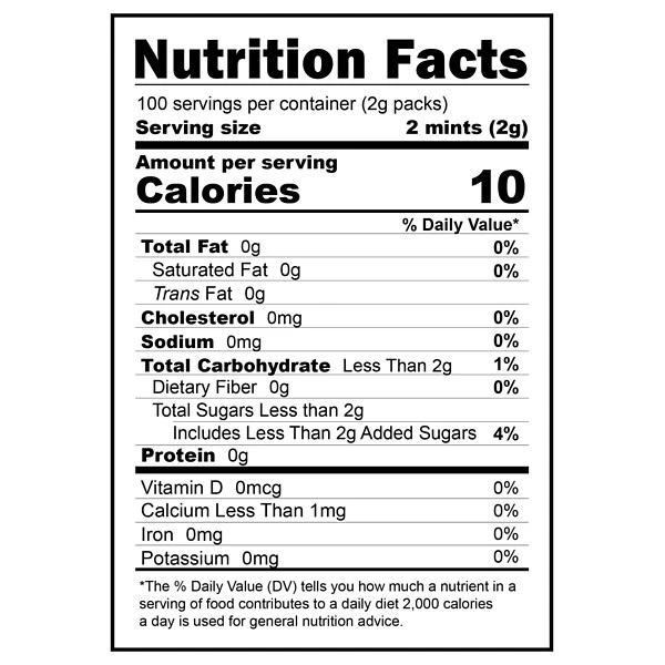 - Box contains 100 individually wrapped mint packs (two mints per pack)